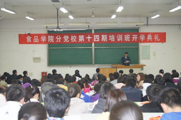 3月13日晚,食品学院分党校在北校区八号楼阶梯教室举行了第十四期入党积极分子培训班开学典礼。院党委书记龙清林、教师代表方建斌、党务秘书董文科、学工秘书冯邦、辅导员刘杰及251位培训班学员参加了开学典礼。张振华副书记主持开学典礼。