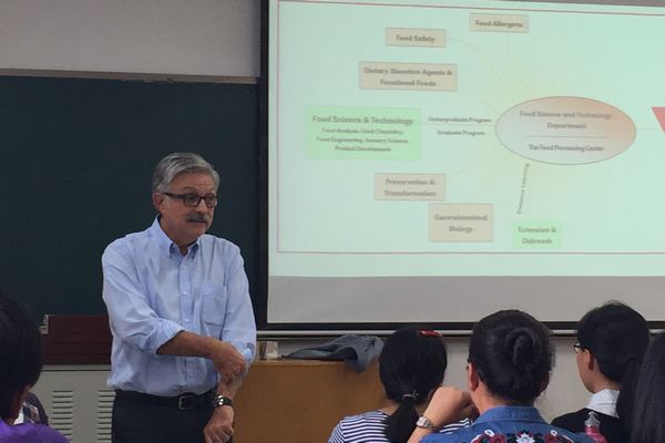 Rolando Flores博士向学生重点讲授了食品科学与工程专业的专业特点、研究领域和发展方向,介绍了内布拉斯加州立大学林肯分校食品与技术系的师资和研究方向等基本情况。