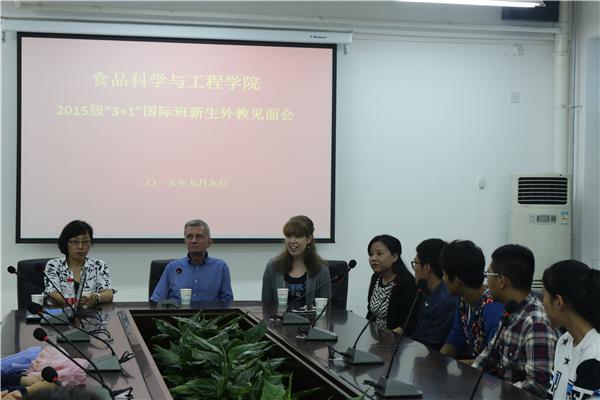 为加强2015级新生与外教的交流与沟通,增进老师与同学们之间的相互了解,9月9日晚,食品学院在食品大楼217会议室召开了2015级 “3+1”国际班新生外教见面会。国际交流中心副处长于瑛,合作交流科科员史文华,“3+1”项目教学办公室负责人张静,外教Heather和Philip,15级辅导员魏月媛参加了此次见面会。