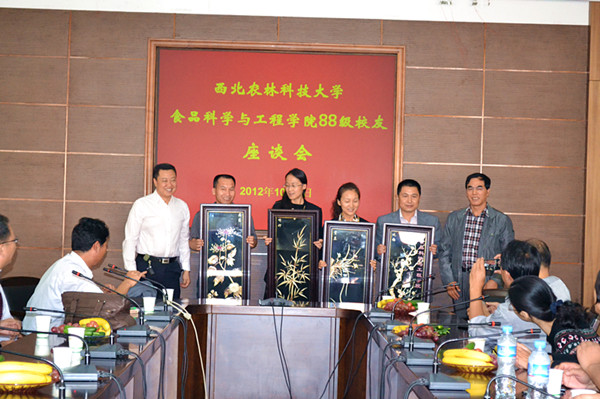 座谈会上,岳田利院长对校友返回母校聚会表示热烈欢迎,他在讲话中回顾了20年前与他们在一起时的生活,流露出浓浓的师生情谊,并从学院的历史沿革、人才队伍建设、学科建设、机构设置等方面向校友们介绍了学院的发展变化,希望他们继续关心和支持学院的发展。阔别20年的校友们踊跃发言,回忆起曾经在校期间的点点滴滴,并逐一介绍了自己的现状。龙清林书记希望各位校友继续加强与学校和学院的联系,重视和支持学校和学院的发展,尽力回报母校、回报学院,并祝愿各位校友身体健康、工作顺利、家庭幸福、生活美满。岳田利院长和龙清林书记代表学院接受了校友向学院赠送的“观梅”、“赏兰”、“听竹”、“品菊”四幅牌匾,牌匾表达了他们对母校和老师的感激之情和美好祝福。