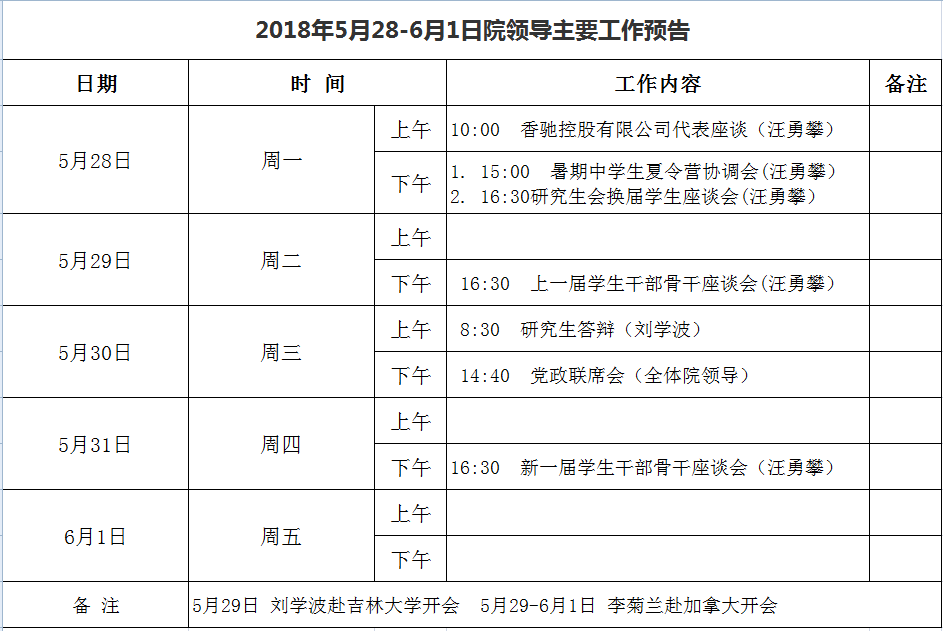 2018年5月28-6月1日院领导主要工作预告
