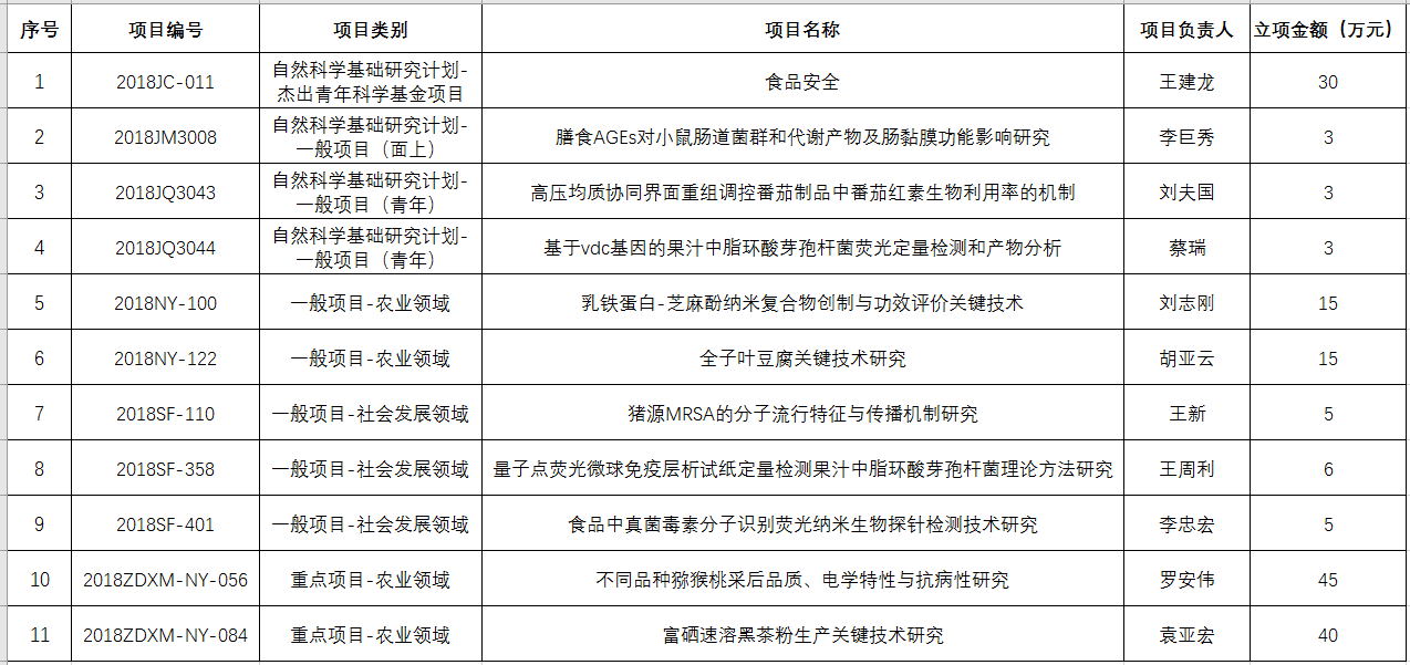 近日,陕西省科技厅公布了2018年度科技计划项目立项结果。我院喜获丰收,共立项11项,其中自然科学基础研究计划杰出青年科学基金项目1项,自然科学基础研究计划一般项目3项,农业领域重点项目2项,农业领域一般项目2项,社会发展领域一般项目3项。资助合同经费总额为170万,较2017年总资助经费总额增长了112.5%。